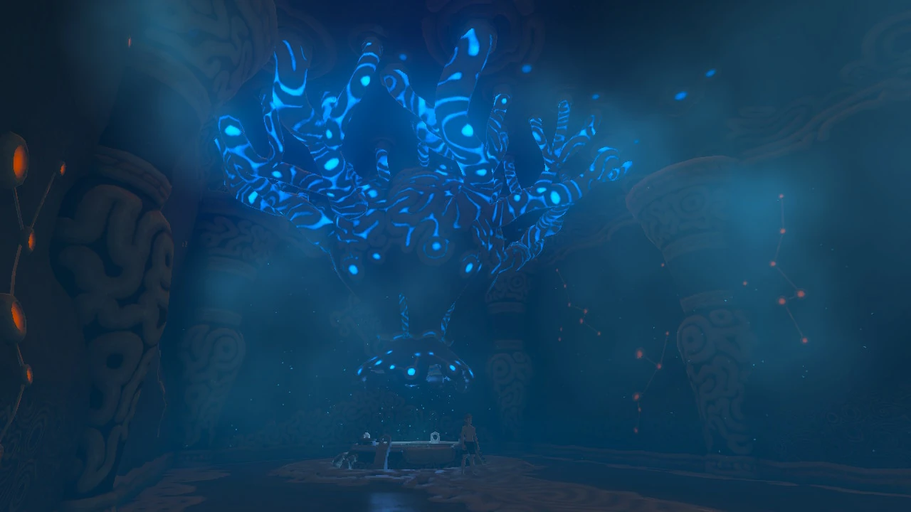 And then Link opened his eyes. A soft blue light was shining on him, and he found himself in a strange bed filled with water. He sat up, confused. Why was he back at the Shrine of Resurrection? He hopped off the bed, but there was no floor to meet his feet and he tumbled back into darkness. Before he knew it, he was suddenly somewhere else. There was a great stone road leading to a tall mountain in the distance. He was standing behind the Princess. Daruk and Mipha were there, as well as the other two Champions that he couldn't quite place, and their faces were a bit fuzzy. The Princess sounded defeated. Praying at the mountain didn't work. And then the earthquake. The Rito Champion flew up. It was Ganon.