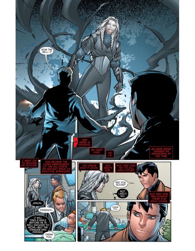 The two start to argue, until the man Jason called Queen made it clear he couldn't even remember Jason's name. Demanding to know what happened to -his boy- Jason started to share a story quickly told of him, a woman named Kori who he explained was Roy's girlfriend and him fighting terrorists in a New Orleans swamp and things went real bad. Kori had done this to Roy. A loud noise came from inside Roy's room as the two men charged for the door...
