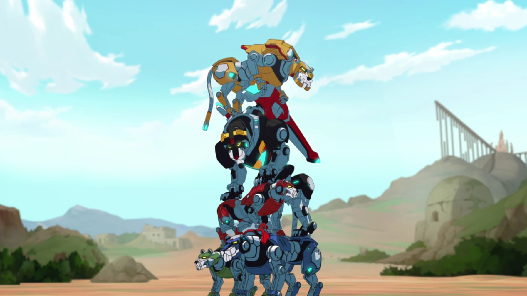 [Now that they got that sorted out, it seems they know what they are doing, the larger blue and yellow lions on the bottom with the red and green lions standing on top of them respectively and the black lion lowers carefully down onto the backs of the red and green lions to form this]